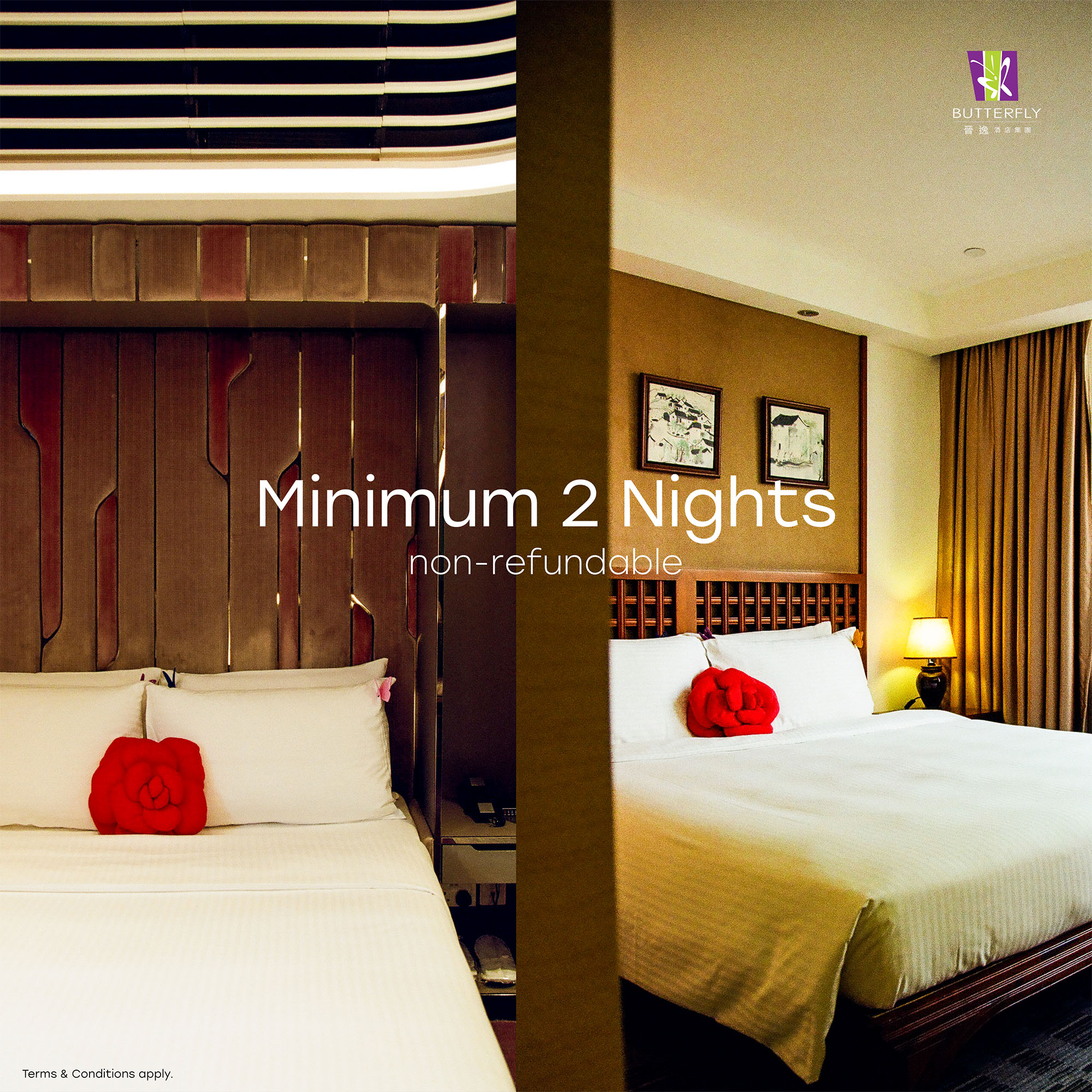 - Offer is only applicable to booking all rooms at Butterfly Hotels in Hong Kong.